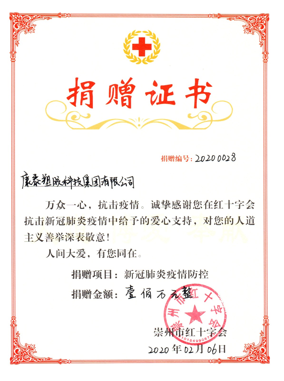 2022.03康泰集團捐款100萬元助力崇州市疫情防控阻擊戰(zhàn)2020年1月,正當(dāng)全國人民喜迎新春佳節(jié)時,一場突然而來的新型冠狀病毒肺炎疫情肆虐中華大地。面對新型冠狀病毒全民戰(zhàn)爭,直接關(guān)系國家民族、企業(yè)興衰、自身安危,康泰塑膠科技集團有限公司作為一家有使命、有擔(dān)當(dāng)?shù)慕ú钠髽I(yè),集團董事長林云青...閱讀人數(shù):9350 -