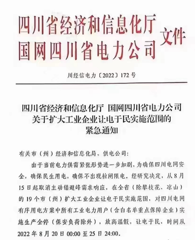 近期,因極端高溫天氣等原因,四川工業(yè)企業(yè)“臨時限電通產(chǎn)”引發(fā)行業(yè)高度重視。此前,相關(guān)部門下發(fā)通知,將限電停電期定為8月15日至20日。不過由于高溫天氣并未得到明顯好轉(zhuǎn),電力供需緊張形勢進一步加劇,8月20日四川經(jīng)信廳、國網(wǎng)四川電力公司發(fā)布的一份《關(guān)于擴大工業(yè)企業(yè)讓電于民實施范圍的緊急通知》,將限電期限延長至25日,使得限電總時長延長到11天.