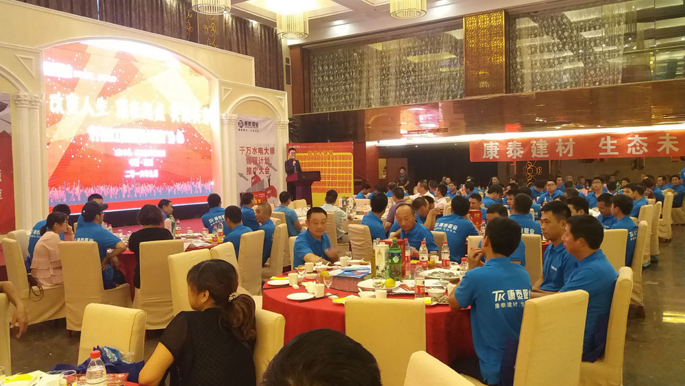? ? ? ? “‘改變?nèi)松②A在起點(diǎn)、共用共享’浙江康泰千萬水工錦程計(jì)劃大型推廣會” 9月23日重回主場浙江湖州。這是繼江西上饒之后的第三場會議。浙江基地總經(jīng)理潘明正、集團(tuán)市場總監(jiān)鄭光鏵、集團(tuán)營銷顧問王楨、浙江基地家裝部總監(jiān)王兵、湖州物流中心總經(jīng)理管俊華等出席會議。湖州區(qū)域水電工、部分重點(diǎn)經(jīng)銷商以及浙江康泰銷售團(tuán)隊(duì)全體人員參加了本次會議。