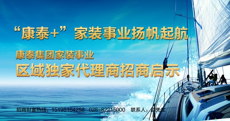 ? ? ? ?“康泰+”家裝事業(yè)現(xiàn)已面向全國誠招區(qū)域獨家代理商,選擇康泰,與康泰同行,您不再孤軍奮戰(zhàn),因為有康泰集團堅實后盾,有一支高效率的營銷團隊時刻準備著為您服務(wù),您的事業(yè)我們?nèi)膛惆?、共同前行!現(xiàn)區(qū)域獨家代理首次全線開放,獨霸一方的市場機會僅有一次,全城獨家代理商僅有一席,請您亮劍!