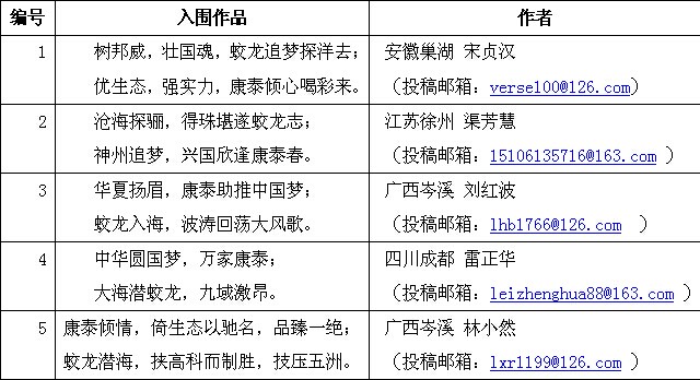 ???? 由康泰塑膠科技集團(tuán)公司特邀書法家林嶠先生、楹聯(lián)家羅永嵩先生發(fā)起的“為蛟龍?zhí)柅I(xiàn)禮”對(duì)聯(lián)征集活動(dòng)從2014年6月5日開(kāi)始,至2014年6月14日截止,歷經(jīng)10天活動(dòng)組委會(huì)通過(guò)企業(yè)郵箱(ktjt@ktsj.com.cn、ktsj@ktsj.com.cn)、“康泰塑膠集團(tuán)”新浪官方微博、“康泰塑膠集團(tuán)”官方微信訂閱號(hào)三種投稿渠道共征集到有效對(duì)聯(lián)作品373幅,現(xiàn)經(jīng)書法家林嶠先生、特邀楹聯(lián)家羅永嵩先生以及康泰集團(tuán)領(lǐng)導(dǎo)組成的評(píng)審組依據(jù)題材切中、寓意內(nèi)涵、平仄押韻、節(jié)奏相應(yīng)等標(biāo)準(zhǔn)對(duì)投稿作品進(jìn)行層層篩選,本著作品充分表達(dá)“蛟龍?zhí)柤舛丝萍紝?shí)現(xiàn)中華強(qiáng)國(guó)夢(mèng);康泰生態(tài)建材實(shí)業(yè)興邦;對(duì)聯(lián)國(guó)粹彰顯愛(ài)國(guó)情懷”的重大意義與內(nèi)涵,最終產(chǎn)生5幅入圍獎(jiǎng)作品,現(xiàn)將名單公布如下(作品排名不分先后):