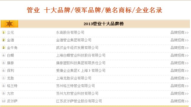 ??? 2014年6月,由品牌排行網(wǎng)主辦的“2014年度中國管業(yè)十大品牌評選” 活動于6月26日完美降下帷幕,康泰塑膠科技集團(tuán)有限公司榮膺“2014年度中國管業(yè)十大品牌”。本次活動以穩(wěn)定大型企業(yè)發(fā)展、帶動行業(yè)品牌化發(fā)展為目標(biāo),以促進(jìn)民族品牌為主題,面向所有行業(yè)所有品牌開放,公開評選。本次評選異常火爆,不但吸引了國內(nèi)近一半的管業(yè)品牌和經(jīng)銷商的參與,同時(shí),也被新浪、網(wǎng)易、人民、新華、中國網(wǎng)等70多家知名網(wǎng)絡(luò)媒體高度關(guān)注,是國內(nèi)管業(yè)行業(yè)少有的大型權(quán)威品牌評選活動。中央電視臺、人民日報(bào)等權(quán)威媒體更是爭相報(bào)道。本次評選,不但成為管業(yè)領(lǐng)軍者齊聚的盛會,更是眾多國內(nèi)優(yōu)秀品牌嶄露頭角,表現(xiàn)自我的絕佳機(jī)會。經(jīng)過緊張激烈的網(wǎng)上投票、資質(zhì)審核以及消費(fèi)者商譽(yù)評價(jià)。