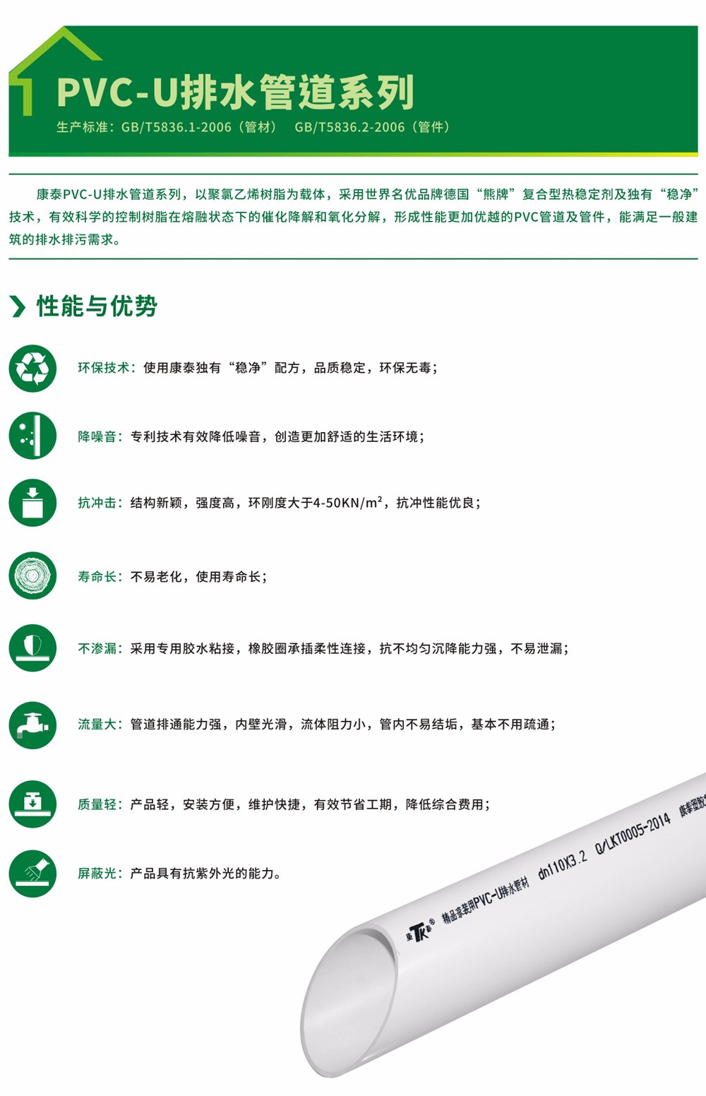 康泰PVC-U排水管道系列,以聚氯乙烯樹脂為載體,采用世界名優(yōu)品牌德國“熊牌”復合型熱穩(wěn)定劑及獨有“穩(wěn)凈”技術,有效科學的控制樹脂在熔融狀態(tài)下的催化降解和氧化分解,形成性能更加優(yōu)越的PVC管道及管件,能滿足一般建筑的排水排污需求。