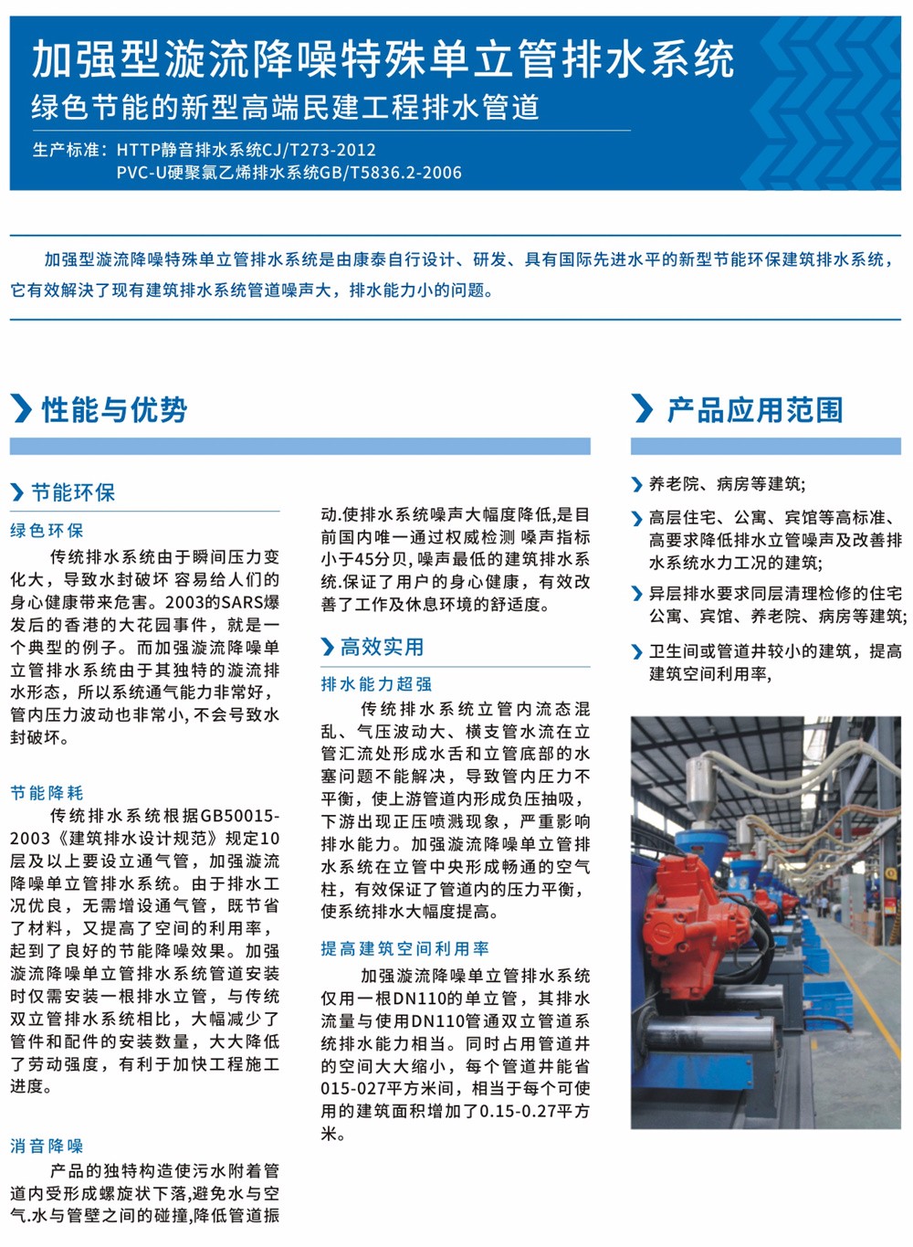 加強(qiáng)型漩流降噪特殊單立管排水系統(tǒng)是由康泰自行設(shè)計(jì)、研發(fā)、具有國際先進(jìn)水平的新型節(jié)能環(huán)保建筑排水系統(tǒng)。它有效解決了現(xiàn)有建筑排水系統(tǒng)管道噪聲大,排水能力小的問題。