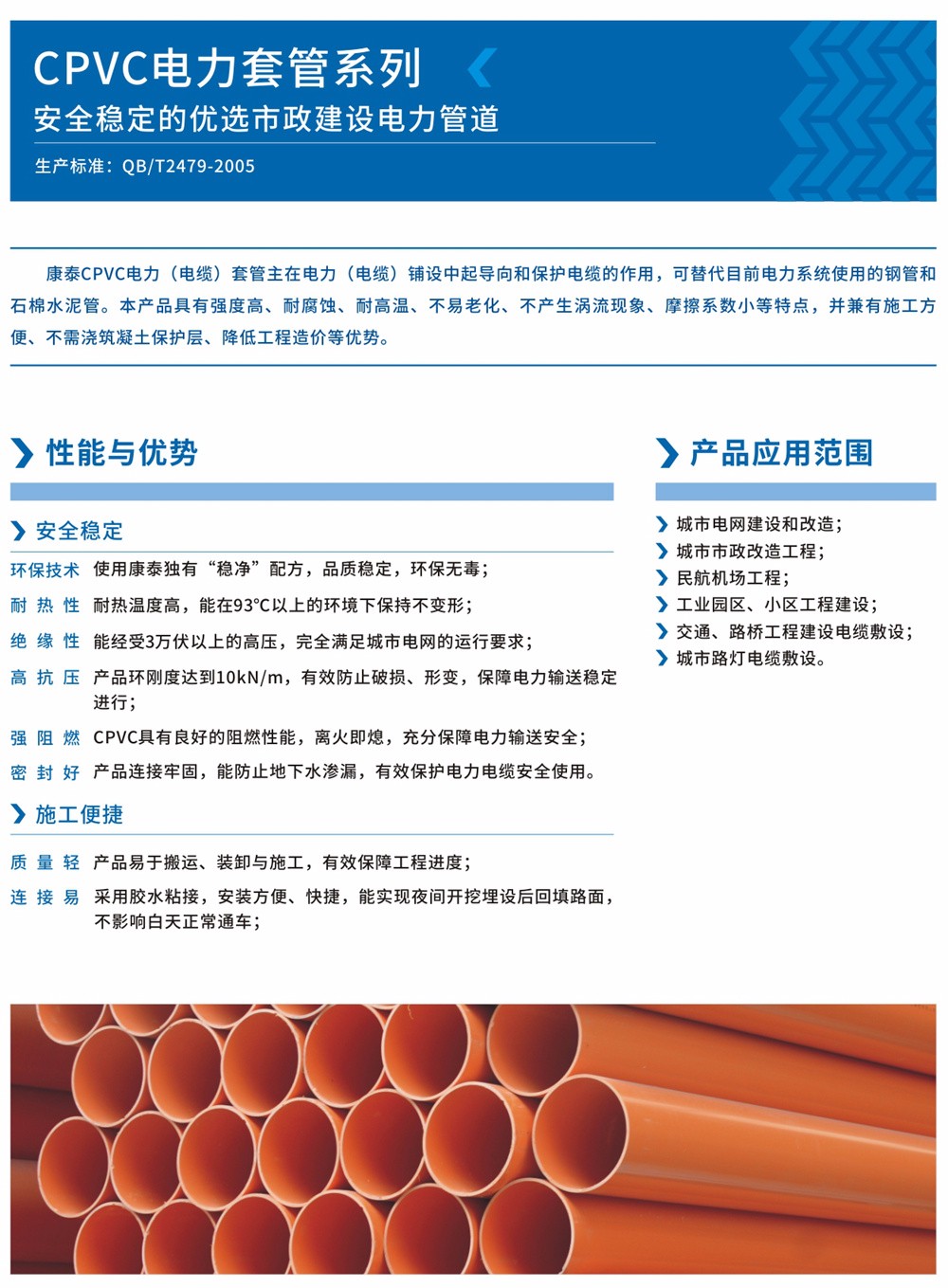 PVC-C埋地式高壓電力電纜套管主要用于電力電纜鋪設并起導向和保護電纜的作用,可替代目前電力系統(tǒng)使用的鋼管和石棉水泥管。本產(chǎn)品具有強度高、耐腐蝕、耐高溫、不易老化、不產(chǎn)生渦流現(xiàn)象、摩擦系數(shù)小、并有施工方便、不需澆筑混凝土保護層、降低工程造價等優(yōu)點。